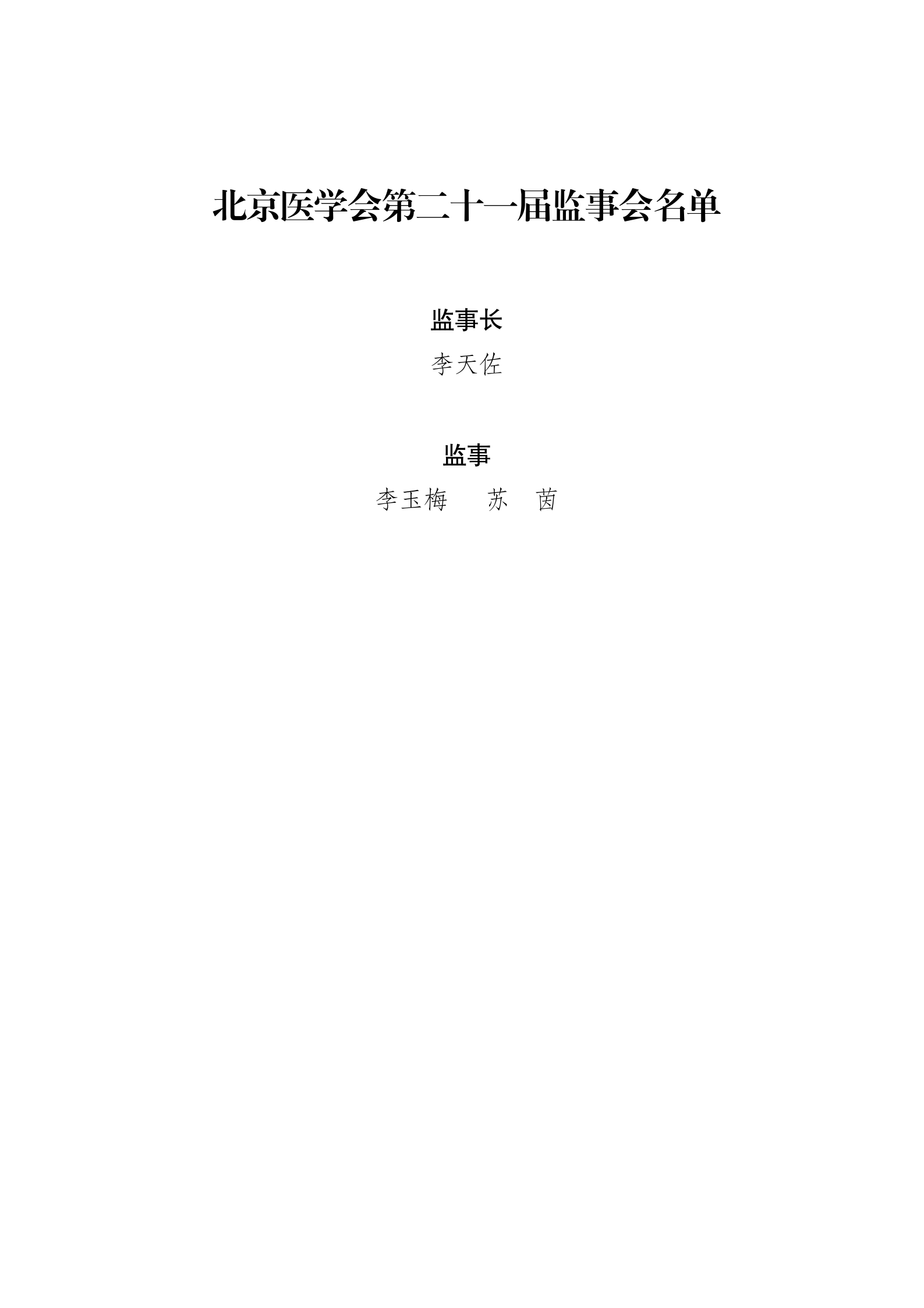 北京医学会第二十一届监事会名单